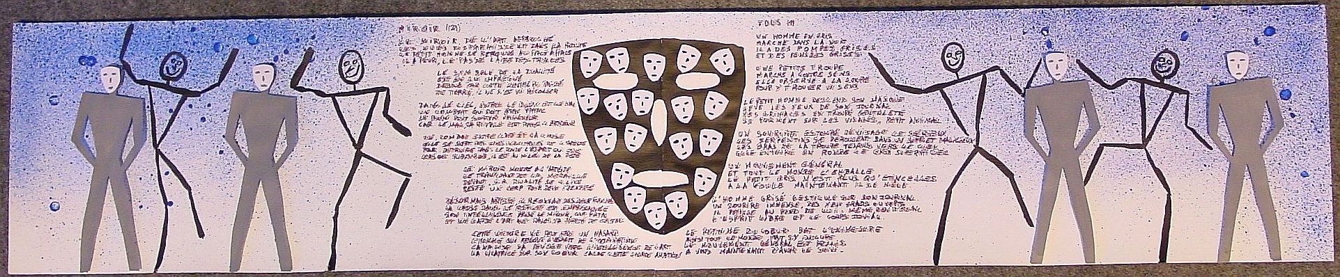 – La dernière partie représente des personnages en doublon. Le premier est peint en filaire noir sur le support. Il est un train de danser et il affiche une mine réjouit. Le second personnage représente un individu en gris campé sur ses 2 jambes et les mains derrière le dos avec une masque blanc devant le visage. Il sera réalisé sur une panneau de contre-plaqué et tiendra debout, ce qui permettra de le décoller de 0,5 à 1 mètre de l’œuvre principale. Ainsi il masquera d’un tiers de premier personnage dansant.