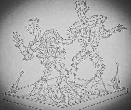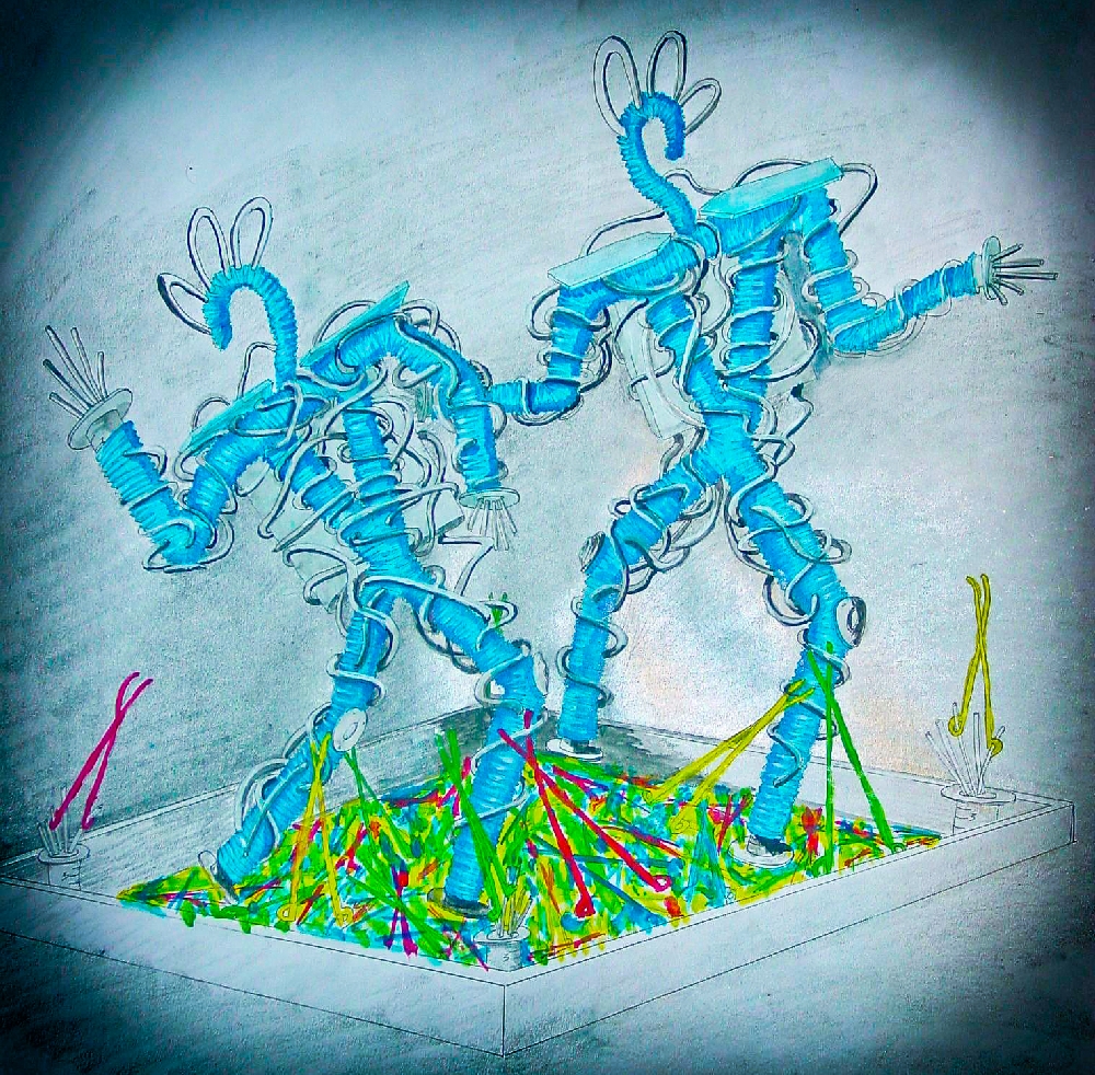 Ces deux personnages sont dans une position de mouvement : Ils dansent. Ils montrent ainsi leur pensées joyeuses et heureuses. L’un d’eux se relève, comme après une chute. Dans le même moment, ils sont aidés pour les pinces multicolores (rouge, bleu, jaune, vert) bienveillantes des médecins. Les mains aux quatres coins du socle représentent celles des docteurs et infirmières qui les encadrent et les soignent. Mes deux personnages symbolisent ainsi la victoire des médecins, du patient et leur bien-être physique et moral après les miracles de la médecine et des recherches.