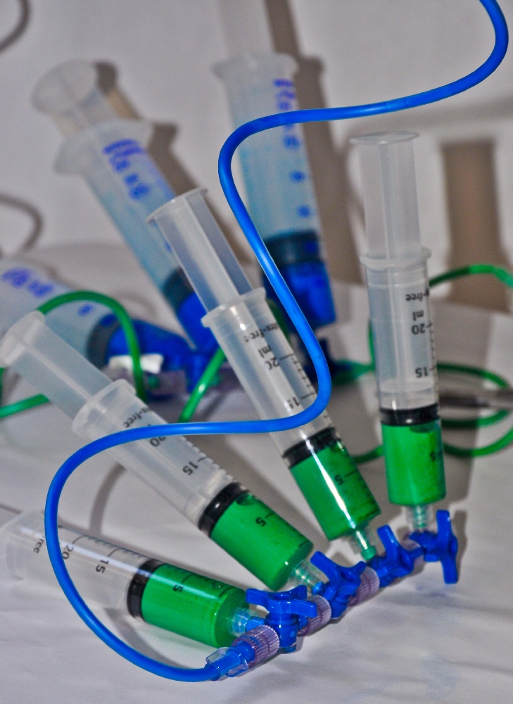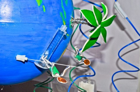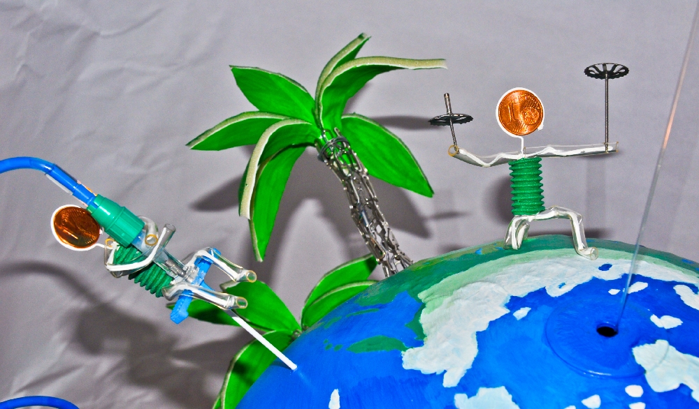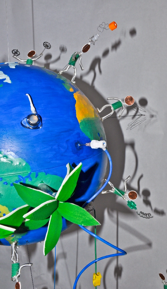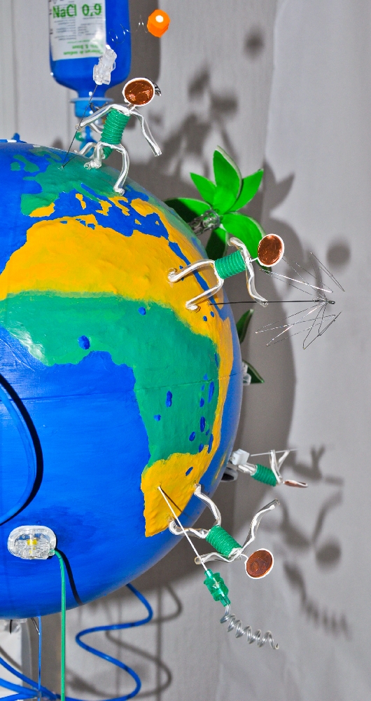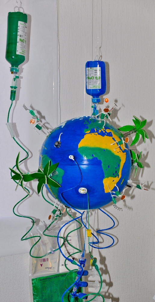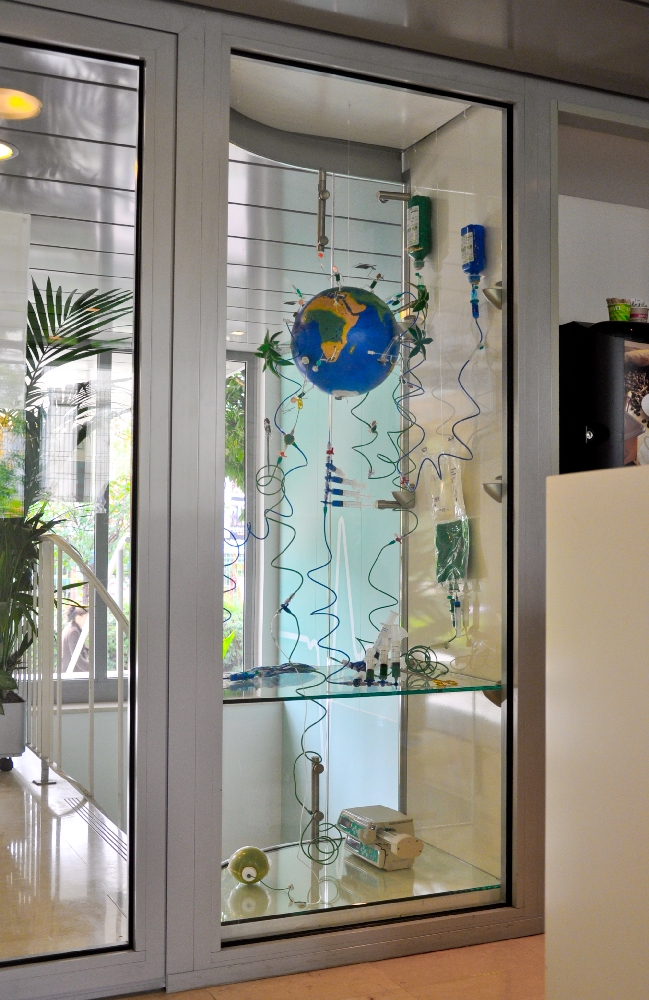 B. Braun protège et soigne notre planète terre, elle est au cœur de son attention. C’est pour cela qu’elle est représentée au centre de l’installation. Différents produits de perfusion B. Braun gravitent autour de la planète bleue et la perfuse afin de lui apporter les solutions pour la protéger ou la soigner. Certains liquides circulant dans les tubes et filtres seront teintés en vert ou en bleu. La planète est peuplée de personnages heureux et joyeux qui dansent avec des ombrelles autour des palmiers. Les personnages seront réalisés avec des tubulures de perfusions et prothèses vasculaires. Les ombrelles, avec des cranofixs et Filtres à Veine Cave. Les palmiers seront composés de Stents coronaires pour le tronc et de pansements teintés en vert pour les feuilles. L’ensemble de l’assemblage sera suspendu au plafond de la vitrine par des fils de nylon transparent. Le globe terrestre en plastique avec des reliefs sera peint et fixé au plafond par un fil de suture et une aiguille.